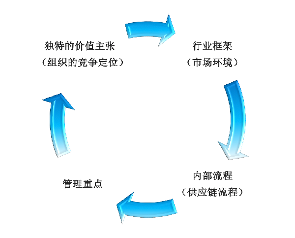 供應(yīng)鏈戰(zhàn)略是從企業(yè)戰(zhàn)略的高度來對供應(yīng)鏈進(jìn)行全局性規(guī)劃,它確定原材料的獲取和運(yùn)輸、產(chǎn)品的制造或服務(wù)的提供、產(chǎn)品配送和售后服務(wù)的方式與特點(diǎn)。一般情況下,組織的供應(yīng)鏈戰(zhàn)略是由四個要素之間的相互關(guān)系決定的,即行業(yè)框架(市場環(huán)境);獨(dú)特價值主張(組織的競爭地位)、管理重點(diǎn)(供應(yīng)鏈流程與業(yè)務(wù)戰(zhàn)略之間的聯(lián)系)以及內(nèi)部流程(供應(yīng)鏈流程)。