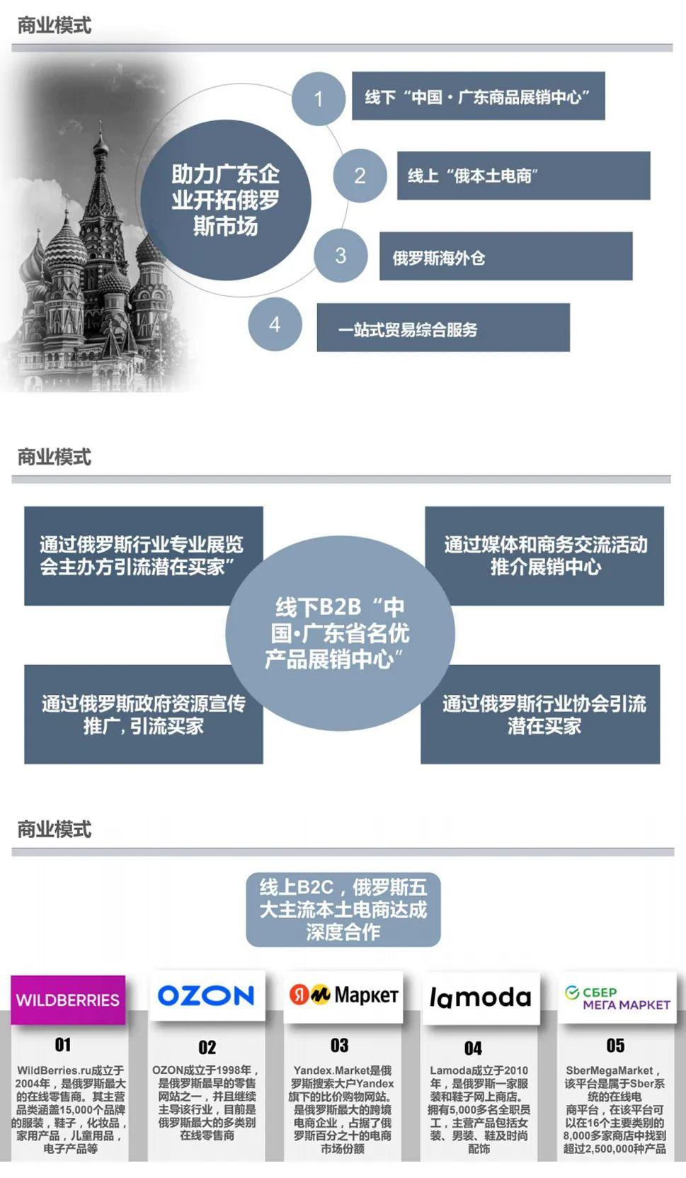 其中也包括建立廣東俄羅斯線上銷售平臺“俄羅斯粵商城”,為廣東品牌提供在線銷售渠道,幫助廣東企業(yè)產(chǎn)品入 駐俄羅斯本土電商平臺